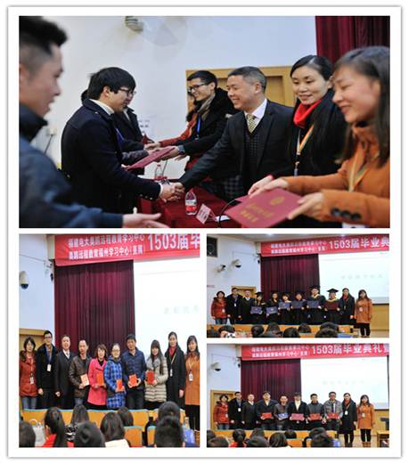 典礼中期,由各校代表上台领取毕业证书及学位证书,同时对优秀学员进行颁奖,会场洋溢着喜悦、热烈的气氛。最后,大家在愉快与不舍中合影留念。至此,2015年春季第一批毕业典礼圆满结束。