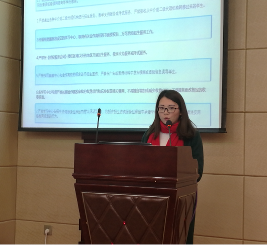 会中,奥鹏远程教育福州学习中心常务副主任张文新、副主任姜学奇、市场部副主任江丽萍老师与学务部副主任江燕老师,分别就学习中心发展规划、《奥鹏远程教育福州学习中心招生、教学教务、考务工作管理办法》、2018年的招生政策及高校学务考务作了大会发言。
