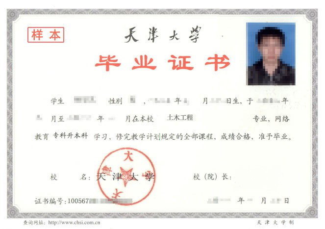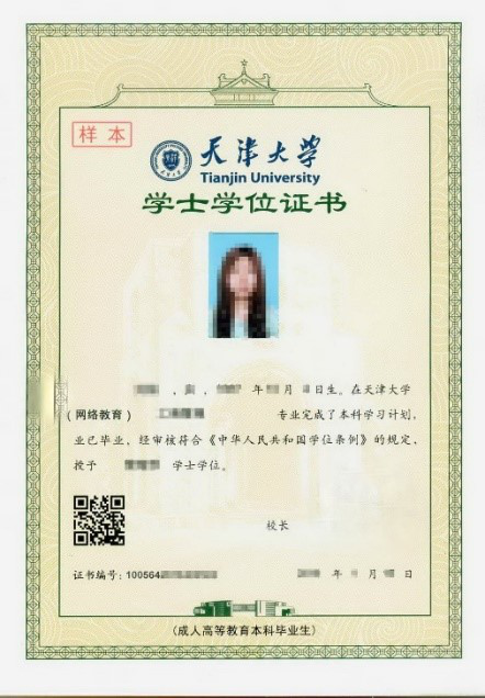 学生在学习期限内修满所修专业教学计划规定的全部学分、考试成绩合格,且须通过教育部规定的现代远程教育试点高校网络教育部分公共基础课全国统一考试,可获得国家承认的由教育部统一电子注册的天津大学毕业证书,注明网络教育,加盖“天津市成人高等教育证书专用章”,电子注册中办学类型代码为“7”。符合教育部、天津市及天津大学有关成人学位授予条件者,授予成人高等教育学士学位。