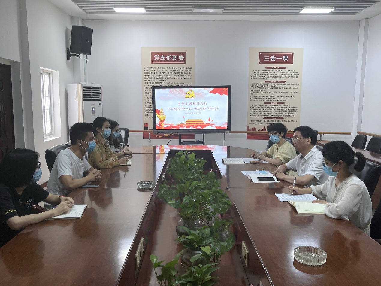 7月7日,远程教育学院以“汲取思想伟力 凝聚奋进力量”为主题开展七月主题党日活动,阅读分享《闽山闽水物化新-习近平福建足迹》一书,两名党员做主题分享,全院教职工参加。