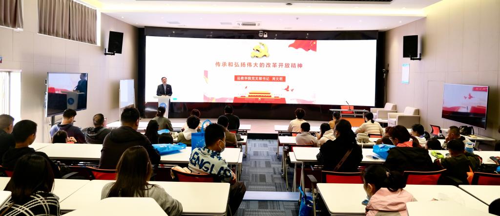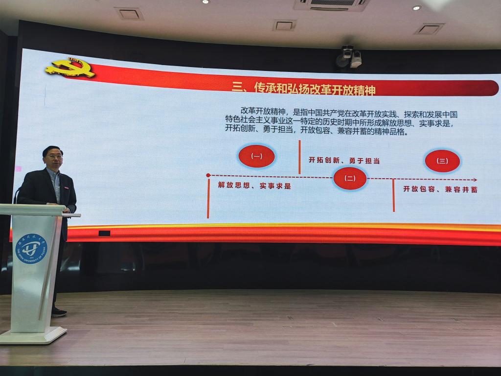 周文明从改革开放的历史进程、改革开放的伟大成就、传承和弘扬改革开放精神三个方面展开阐述,通过生动的案例和统计数据,向党员干部及同学们呈现了改革开放给中国带来的巨大变革。他提出,广大师生要传承和弘扬伟大改革开放精神,解放思想,实事求是,发扬开拓创新、勇于担当、开放包容、兼容并蓄的革命和创新精神,自强弘毅,励学敦行,为建设新福建而努力奋斗。